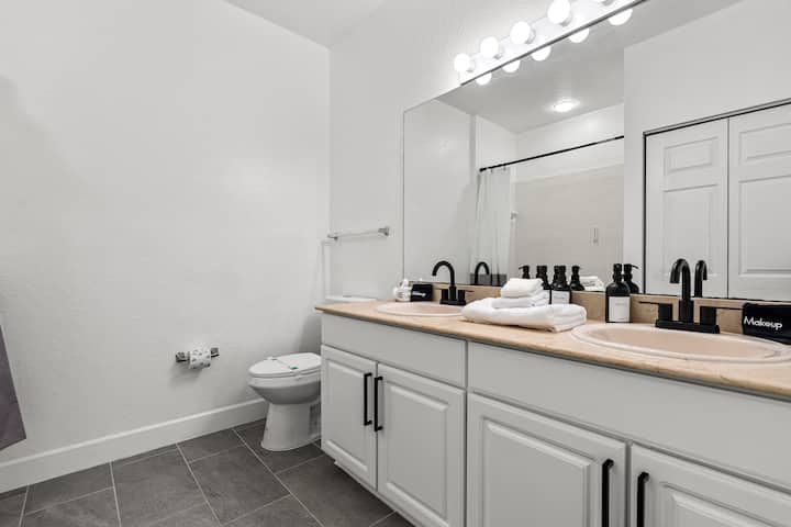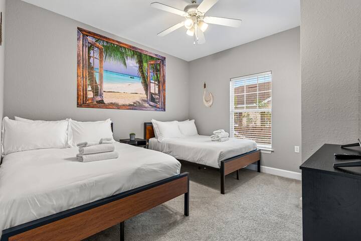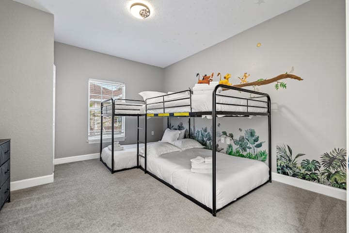 Spacious and family-friendly home in Kissimmee, perfect for groups of up to 12 guests. This 3-bedroom, 2-bath home features a king bed, queen bed, 2 full beds and bunk beds ideal for kids and groups. Enjoy a full kitchen, open living area with a large couch, and in-unit laundry. Guests have access to a community pool and kiddie park. Conveniently located near major Orlando attractions, dining, and shopping—an ideal home base for your Florida getaway.