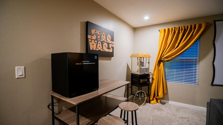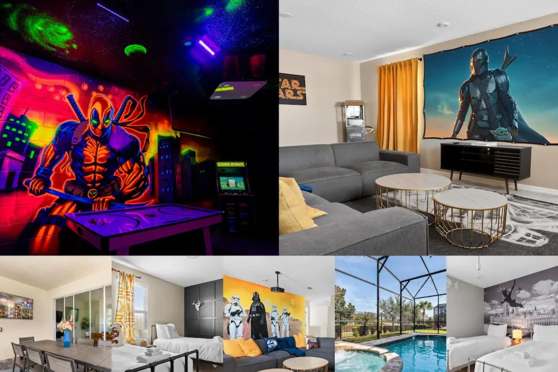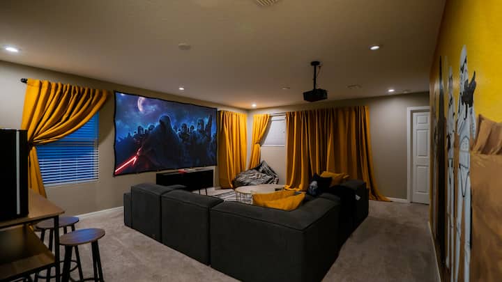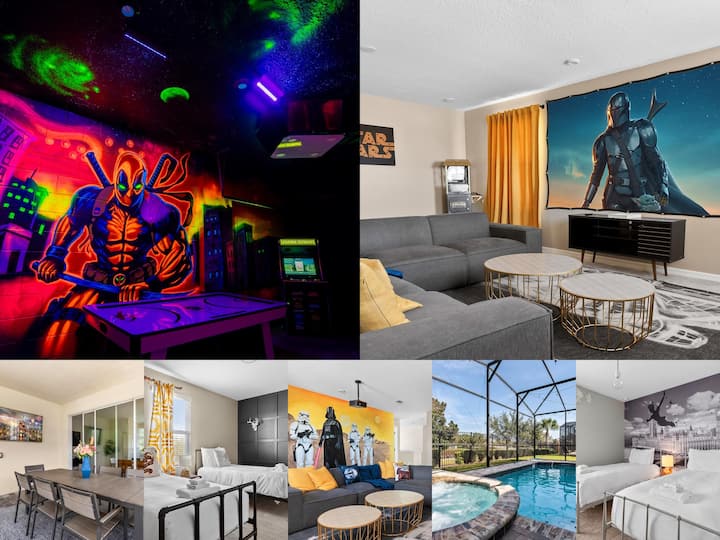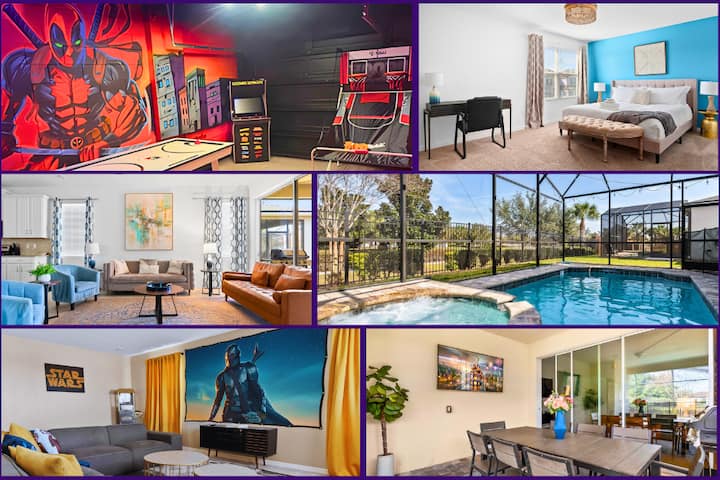 Experience the perfect Orlando escape in this beautifully designed, fully air-conditioned home. Whether you’re relaxing by the private heated pool and spa, catching a film in the theater loft, or challenging friends to air hockey and arcade classics in the game room, this home has everything your group needs for comfort and fun.