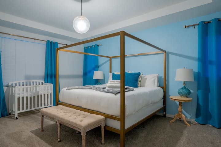Bedroom 4: (Primary Suite): King bed, ensuite with walk-in shower, Smart TV, desk/workstation, and a portable crib