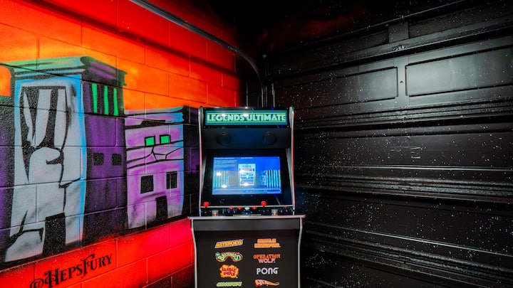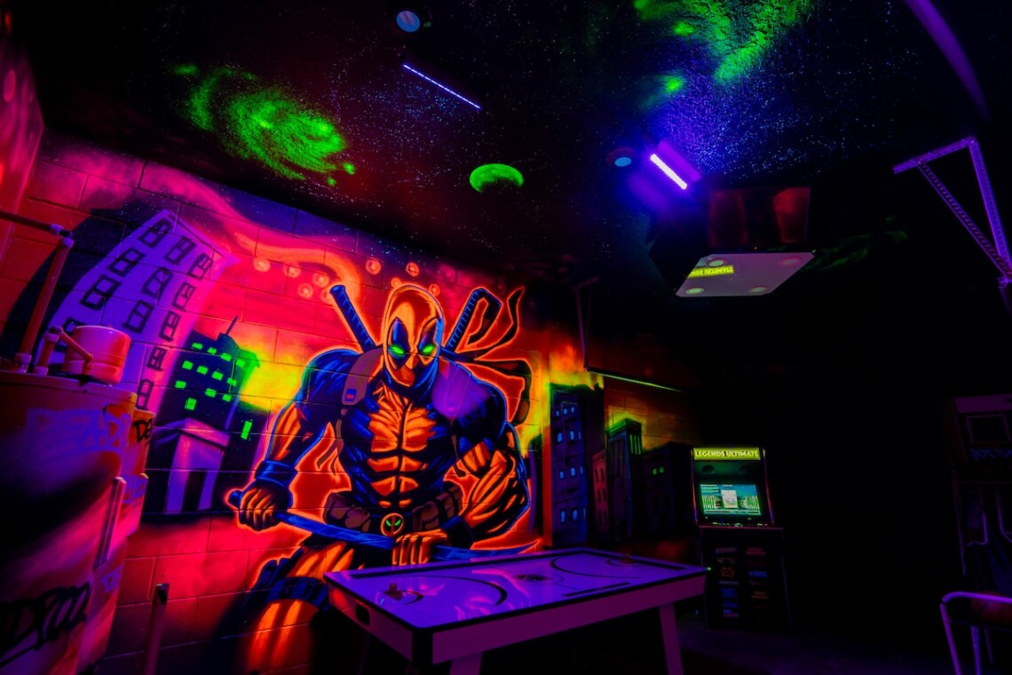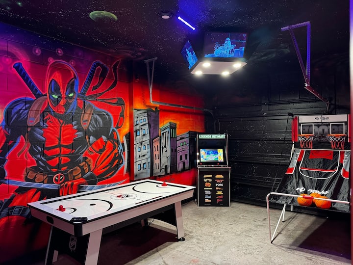 Marvel/Deadpool Garage game room featuring air hockey, arcade classics, ping pong, basketball shootout & Nanotron!