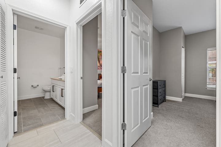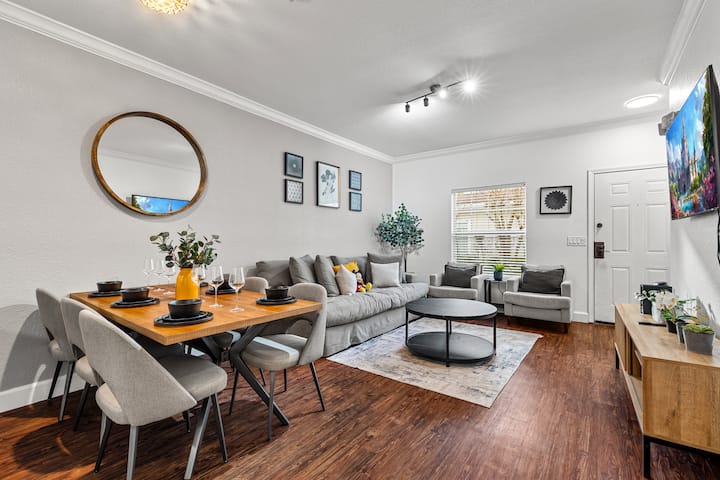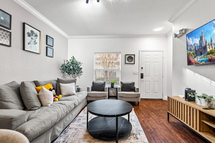 • Living Area: Open-concept living room with comfortable seating, smart TV, and high-speed Wi-Fi, perfect for streaming after a long day at the parks.