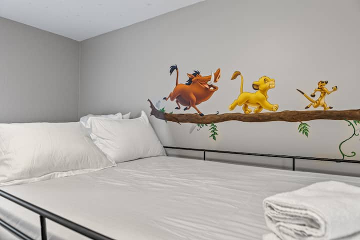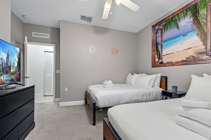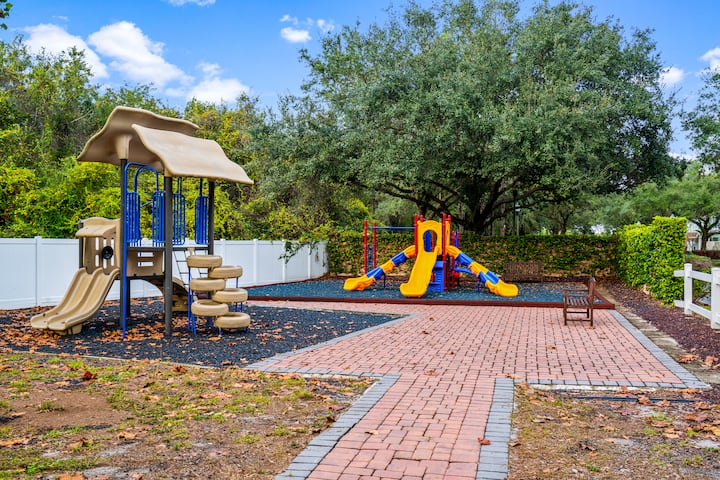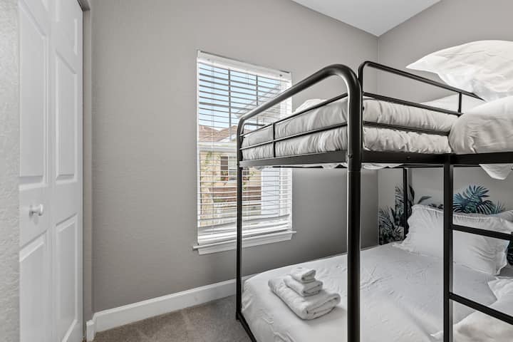Spacious and family-friendly home in Kissimmee, perfect for groups of up to 12 guests. This 3-bedroom, 2-bath home features a king bed, queen bed, 2 full beds and bunk beds ideal for kids and groups. Enjoy a full kitchen, open living area with a large couch, and in-unit laundry. Guests have access to a community pool and kiddie park. Conveniently located near major Orlando attractions, dining, and shopping—an ideal home base for your Florida getaway.